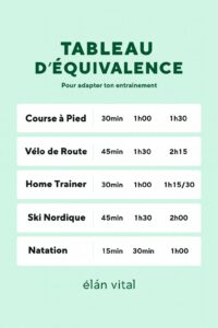 Chaque équivalence est basée sur l’intensité moyenne de l’activité et son impact physiologique. Ce n’est pas une règle rigide, mais un repère utile pour construire des séances cohérentes.